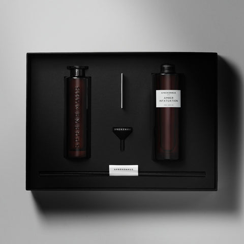 This set consists of a dark, beautiful glass bottle with the SPREKENHUS logo, a recyclable bottle with the Amber Infatuation fragrance oil, a funnel, and sticks to put in the glass bottle. All collected in a beautiful gift set.