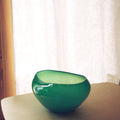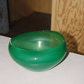 Grønn glasskål med en nydelig bevegelig form, munnblåst av glasskunstner Kari Mølstad.
