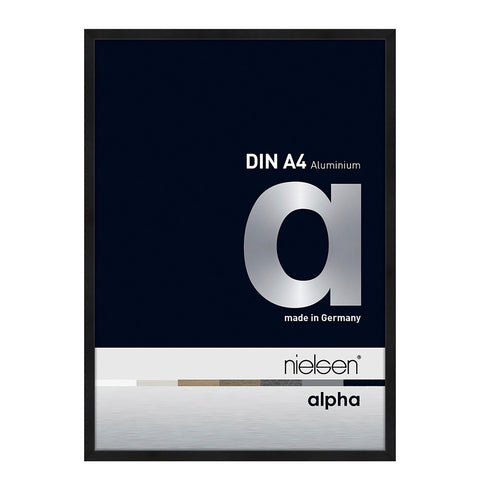 Alpha frame in black aluminum and glass. Perfect for hanging on the wall, the frame has a hanging attachment for both horizontal and vertical hanging. The plate at the back has clips with spring tension that make it easy to insert your image.