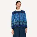 Mid-length jacket with a light textured knit on the flowers. The jacket has a classic fit, round neck and is framed by an elegant, wavy edge.