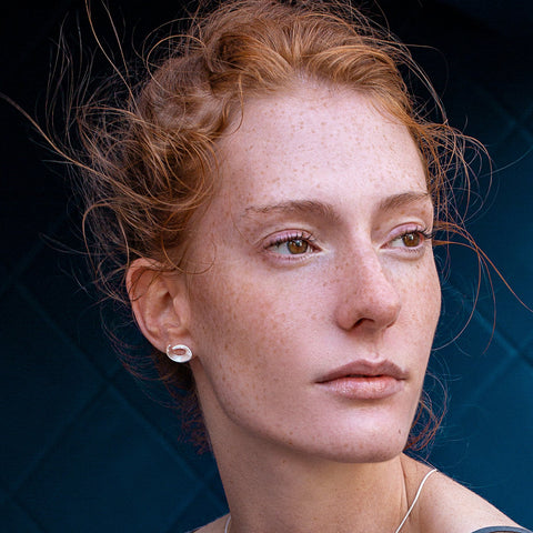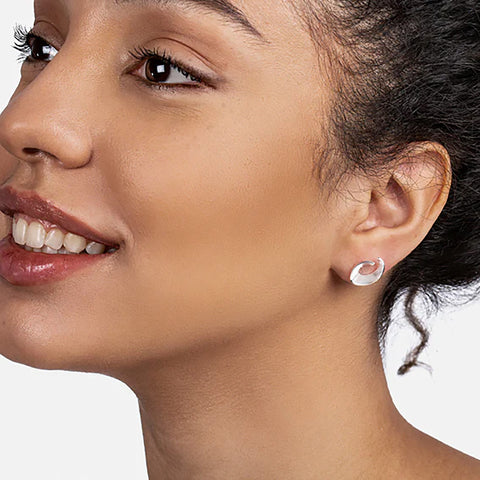 Ergo are small earrings in silver, with a curved shape, like a miniature design of the large Ergo earrings by Kaja Gjedebo. The ear ornament has a dynamic shape that sits well on the ear.