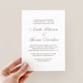 Here we present the invitation in the wedding series ANETTE. The design is based on two decorative fonts that create a classic and romantic expression. The card is printed on the paper quality Conqueror Laid in a thickness of 300 grams in the color tone "Oyster". This is a classic paper that has a slightly ribbed texture and a neutral yellow tone.
