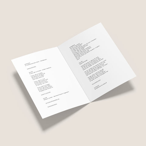 Here we present the wedding program in the CAMILLA wedding series. The design is based on a minimalist font that creates a modern and simple expression. The program is printed on Conqueror Laid paper quality in a thickness of 160 grams in the color tone "Brilliant white". This is a classic paper that has a slightly ribbed texture and a white neutral tone.