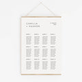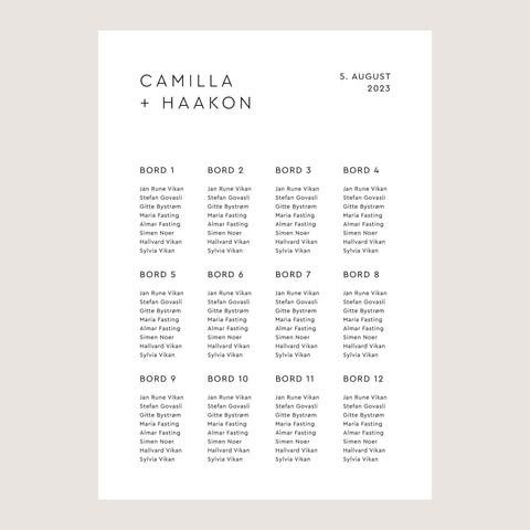 Here we present the A1 table plan in the CAMILLA wedding series. The design is based on a minimalist font that creates a modern and simple expression. The map is printed on Conqueror Laid paper quality in 300 grams thickness in the color tone "Brilliant white". This is a classic paper that has a slightly ribbed texture and a white neutral tone.