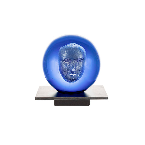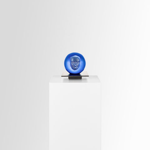 The glass sculpture Headman by Bertil Vallien symbolizes a person enclosed in his own world, silent and watching, with a focus on what exists in the present. The sculpture stands on an iron foot.