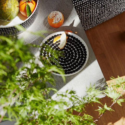 The plate decorated with black and white Räsymatto pattern in the Siirtolapuutarha series, designed by Maija Louekari.