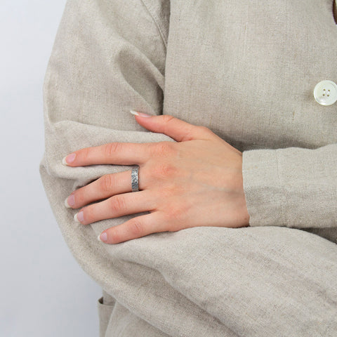 The casting technique Jørn Lang uses gives the silver a rough concrete surface, which he calls concrete silver. This gives the jewelery a rough appearance.