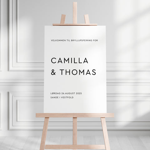 Here we present the A1 welcome sign in the CAMILLA wedding series. The design is based on a minimalist font that creates a modern and simple expression. The sign is printed on Conqueror Laid paper quality in 300 grams thickness in the color tone "Brilliant white". This is a classic paper that has a slightly ribbed texture and a white neutral tone.