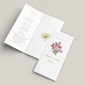 Her presenterer vi vielsesprogrammet i bryllupsserien MARIA. Designen tar utgangspunkt i illustrasjoner av sommerlige blomster. Vi har kombinert med dekorative fonter og harmonerende farger for å skape et moderne og romantisk utrykk. Programmet trykkes på papirkvaliteten Conqueror Laid i tykkelse 160 gram i fargetonen "Oyster". Dette er et klassisk papir som har en lett ribbet tekstur og en gultonet nøytral tone.
