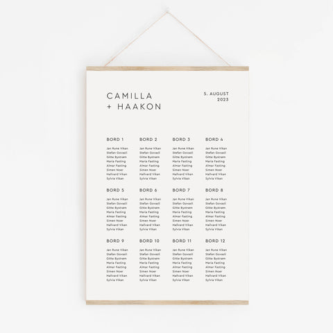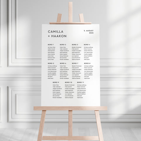 Her presenterer vi A2-bordplanen i bryllupsserien CAMILLA. Designen tar utgangspunkt i en minimalistisk font som skaper et moderne og enkelt utrykk. Kartet trykkes på papirkvaliteten Conqueror Laid i tykkelse 300 gram i fargetonen "Brilliant white". Dette er et klassisk papir som har en lett ribbet tekstur og en hvit nøytral tone.
