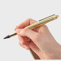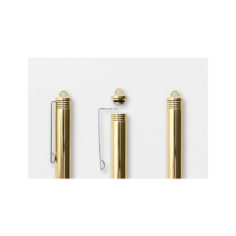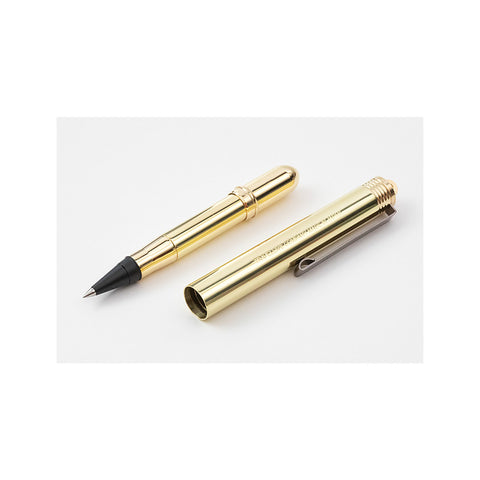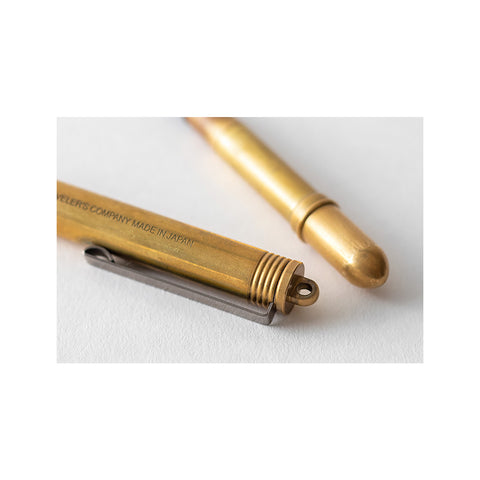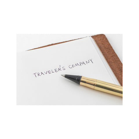 Traveler's Company sin kulepenn i messing er en nett penn i en størrelse som er lett å ha med og som får en god lengde når du tar av lokket for å skrive med den. Pennen er laget i messing og med en klips i stål.