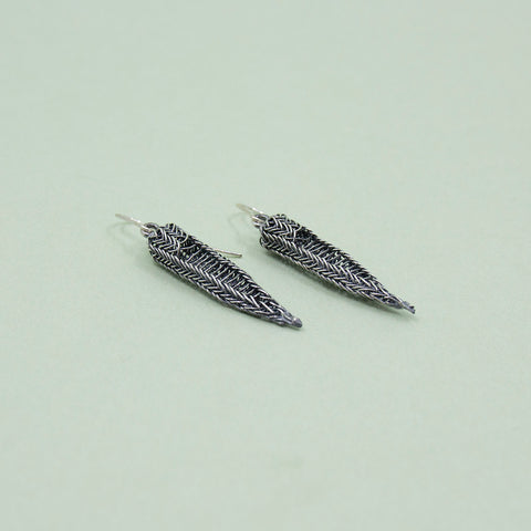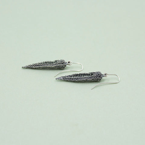 Øredobber formet som lange dråper i strikket sølv. Alle er litt ulike og derfor ekstra spesielle.