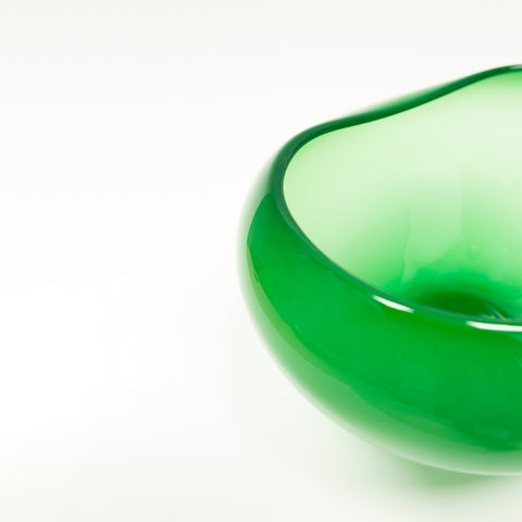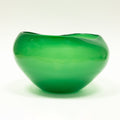 Grønn glasskål med en nydelig bevegelig form, munnblåst av glasskunstner Kari Mølstad.