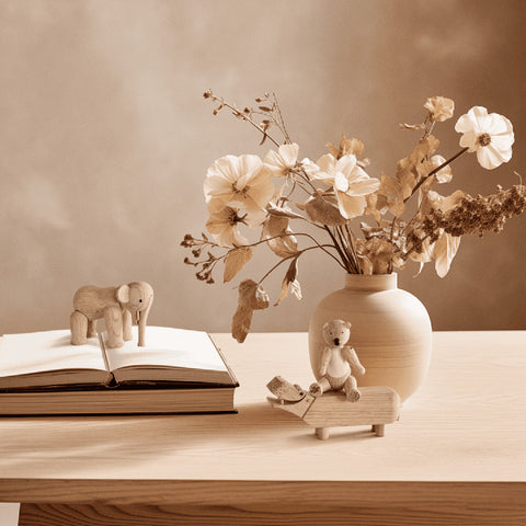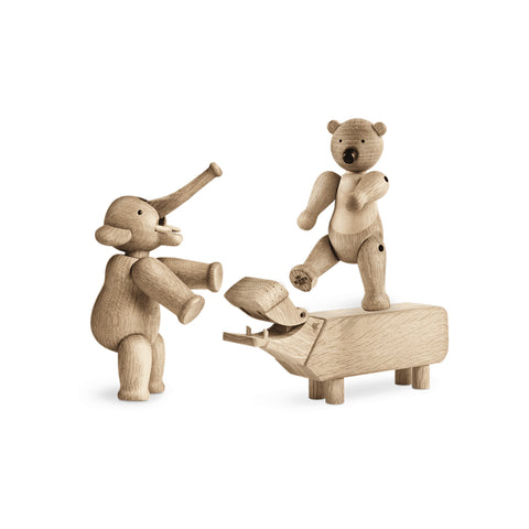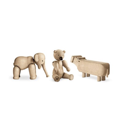 Elefanten, Flodhesten og Bjørnen er 3 av Kay Bojesens ikoniske trefigurer i en ministørrelse, samlet sammen i en fin gaveeske. Dette er gaven du har med deg gjennom hele livet!