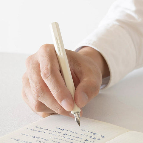 Fyllepennen fra Midori (medium splitt) er enkel å skrive og tegne med. Selve pennen er laget av papir (MAPKA) og har en sekskantform som ligger godt i hånden. Pennen dyppes i blekk ved bruk (ikke patron).
