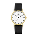 En tidløs og elegant klokke fra Danish Design, like fin til hverdags som til fest. Klokken har tydelige tall, dato, sekundviser med rød arm, 35mm urkasse i gullfarget titan, mineralglass og sort lærrem. Enkel, lettlest og stilfull!