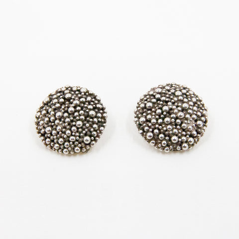 Tidløse øreklips med granuler av sølv festet på plate fra E-Kollektion. De er designet i Sveits og håndlaget i Indonesia.